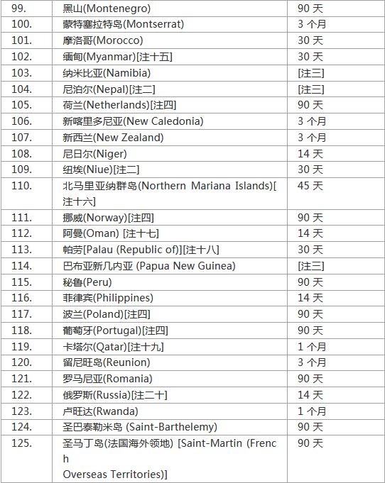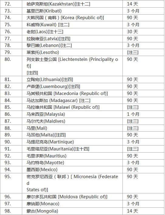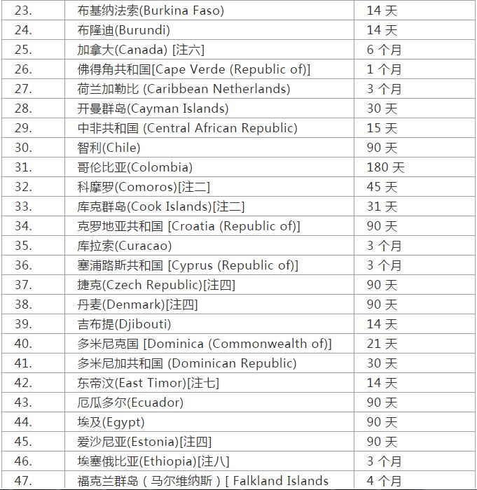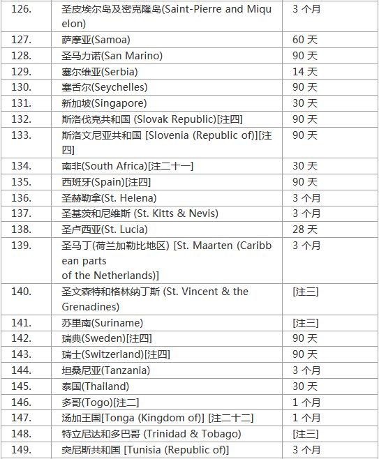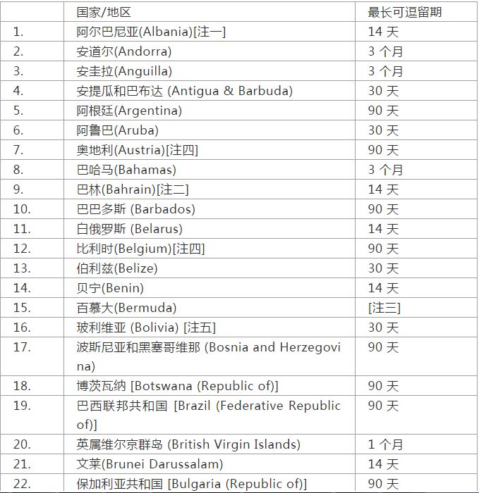 注一 :香港特区护照持有人可享有免签证入境待遇,最长可逗留14天,而总逗留期限为 180 天内,不得超过 90 天。